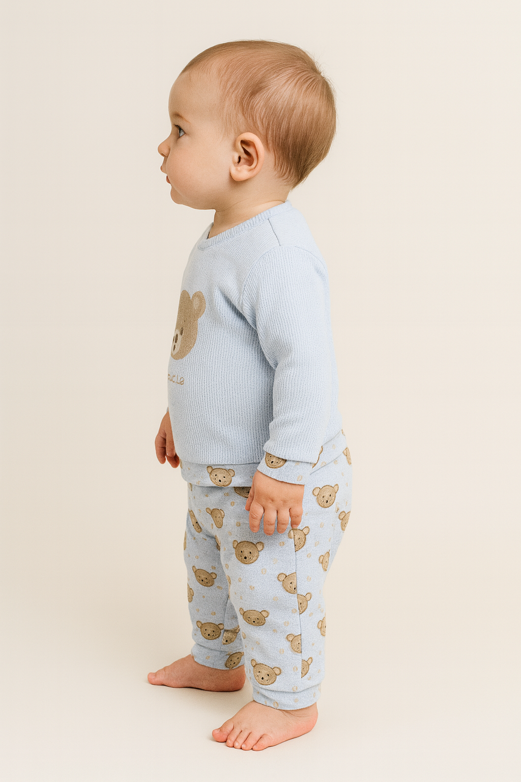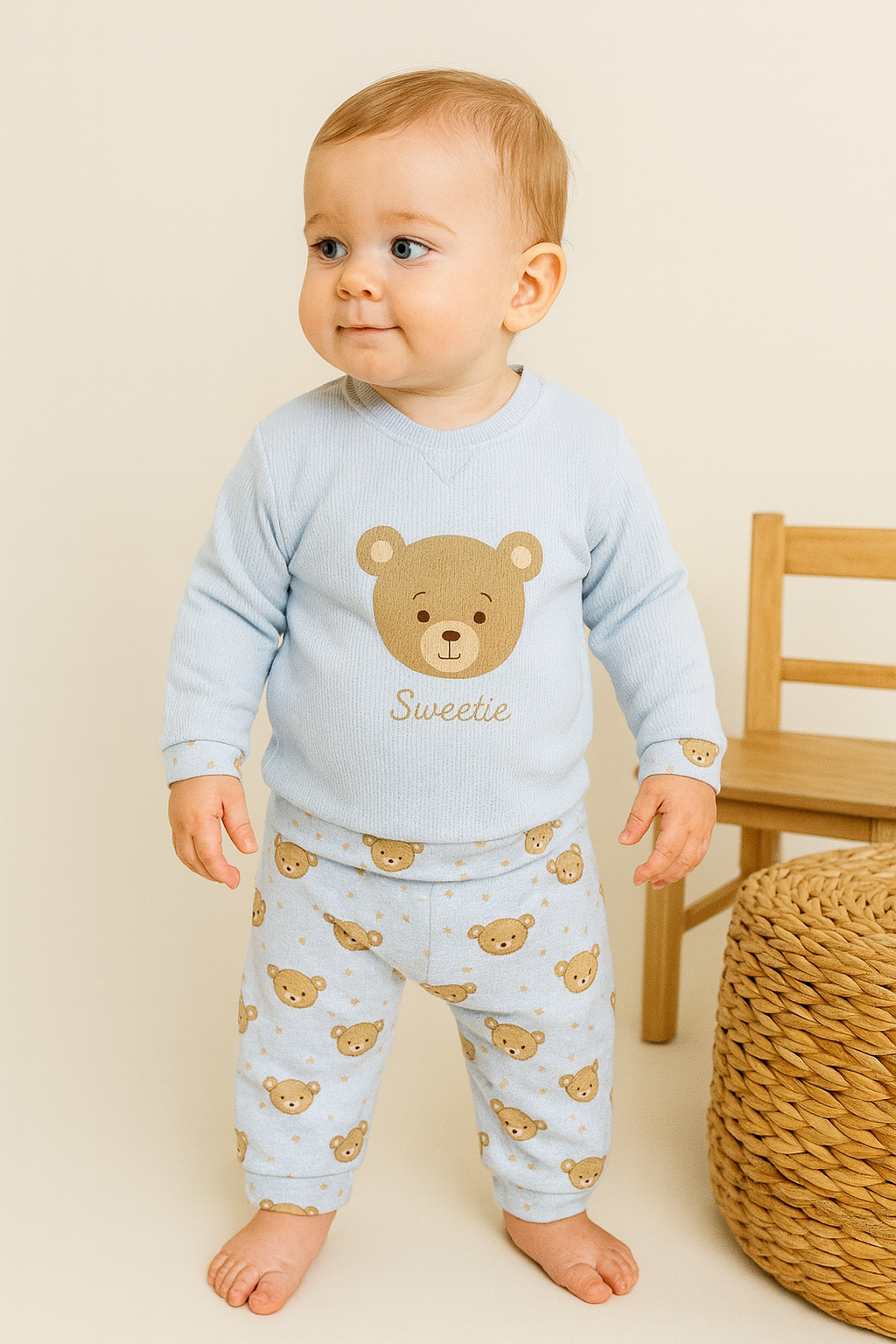 Erkek bebek ayıcık kafa ve yıldız baskılı pamuklu takım