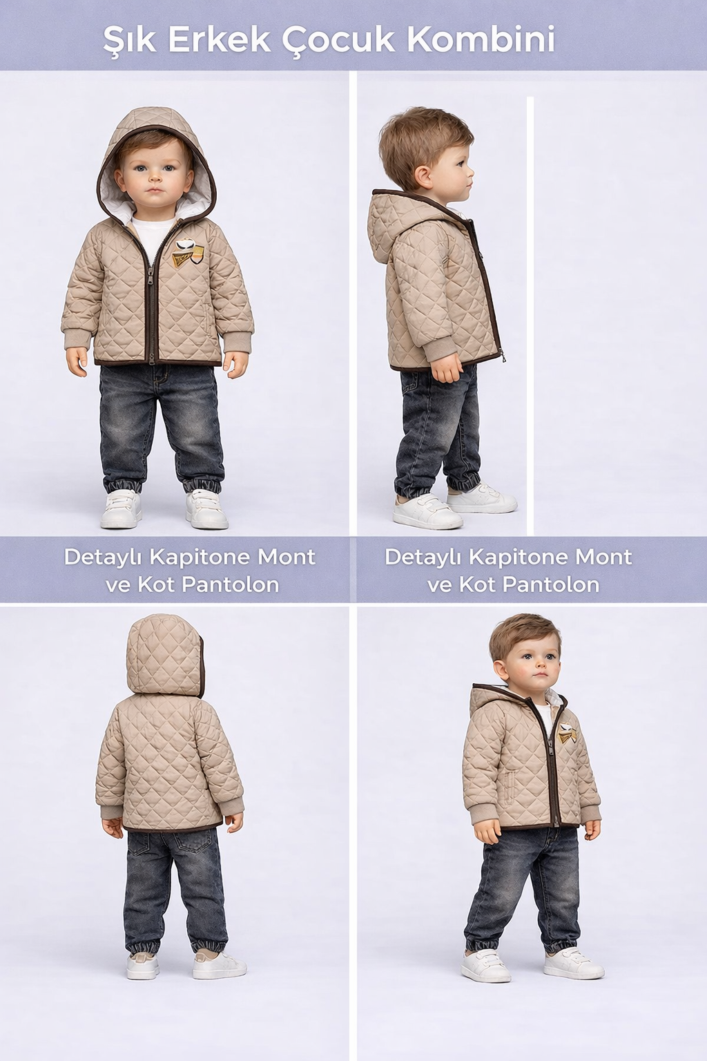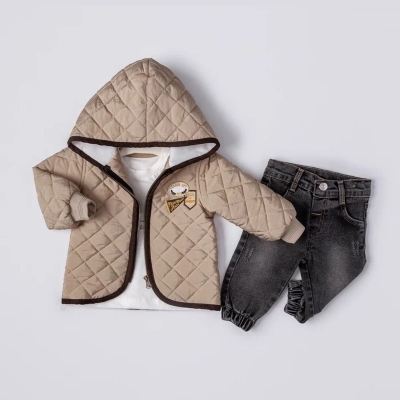 Erkek Bebek kapşonlu - kapitone montlu -kot pantolonlu 3lü takım