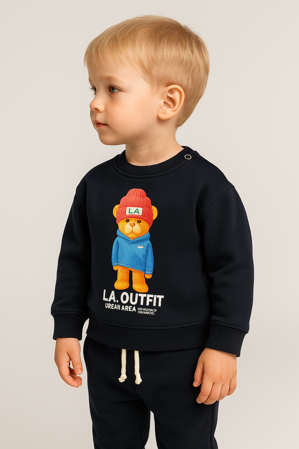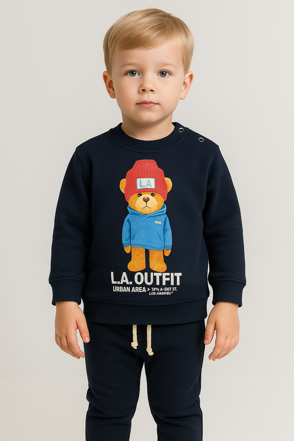 Erkek Bebek şapkalı ayıcık baskılı iç kısmı şardonlu takım