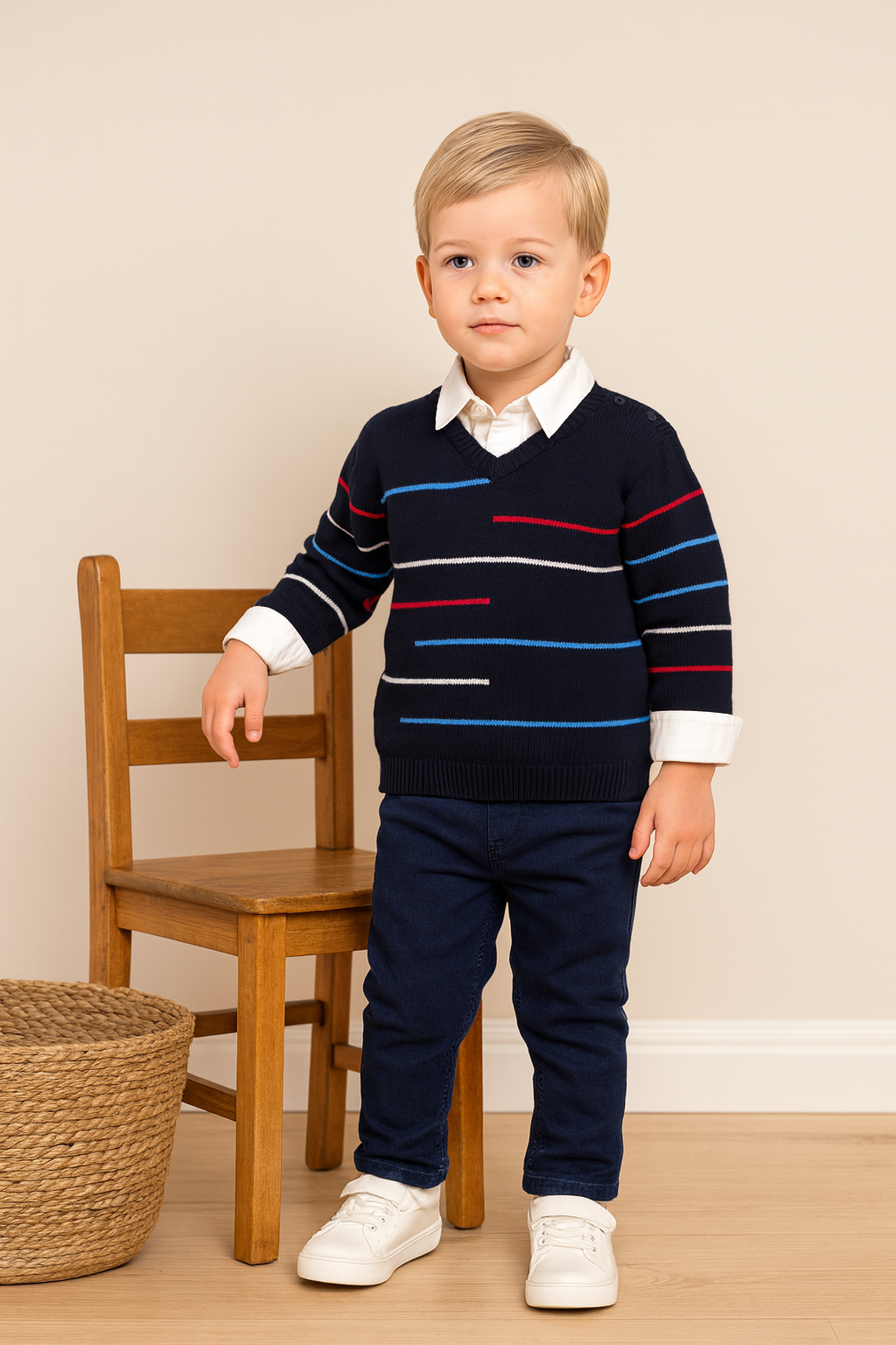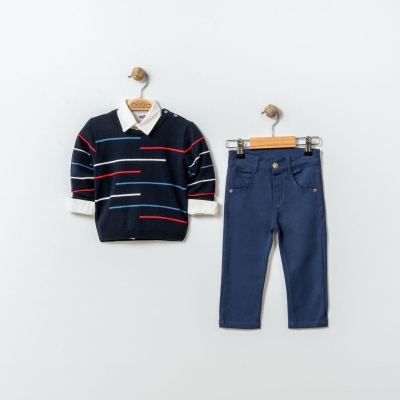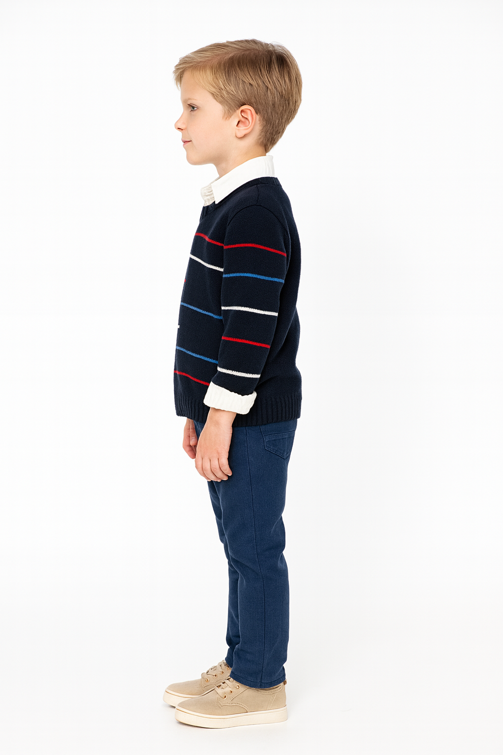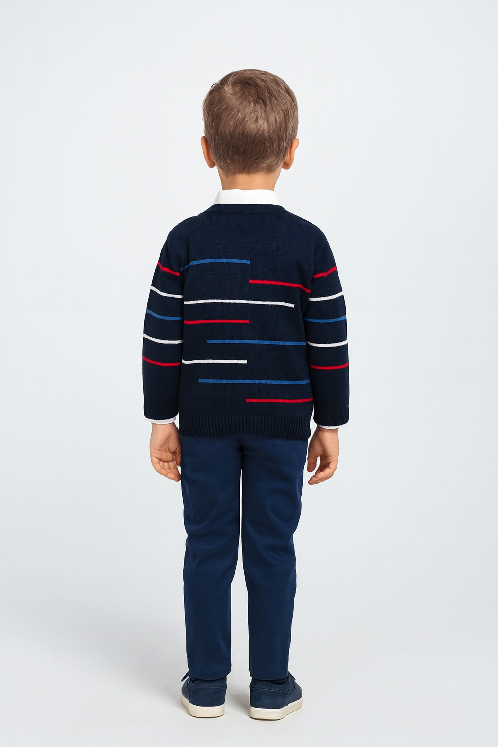 Erkek Çocuk çizgi desenli kazak keten pantolonlu gmlekli 3lü takım