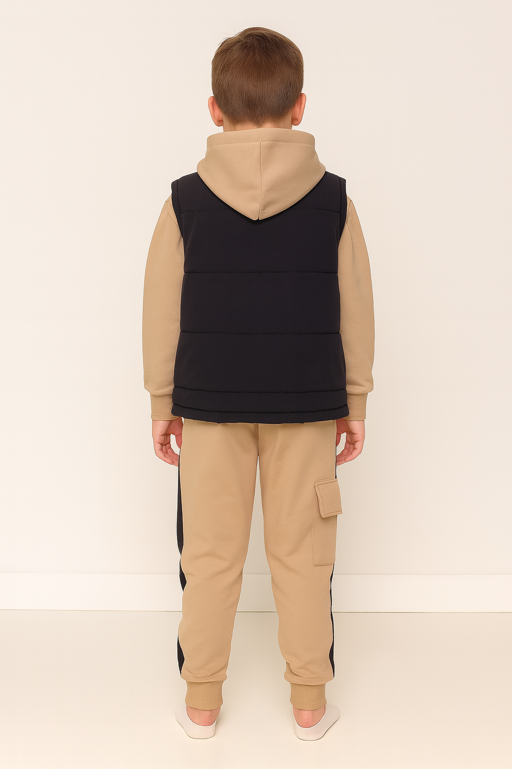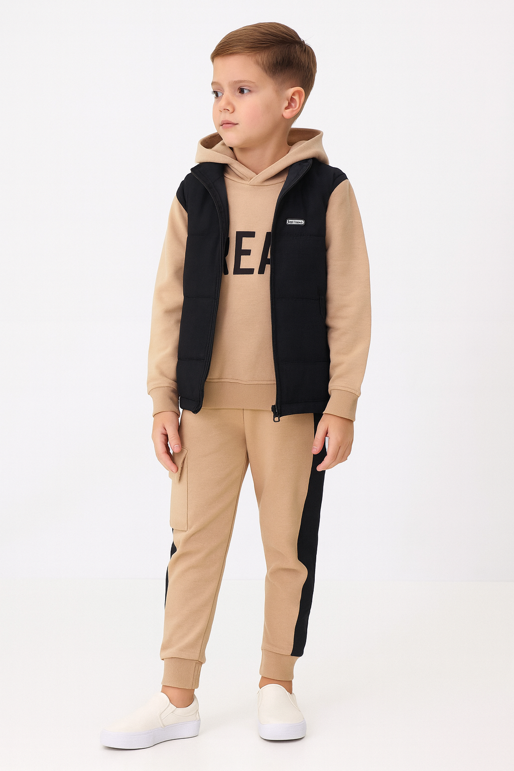 Erkek çocuk kapitone siyah yelekli-kapşonlu sweatshirt-eşofman takım