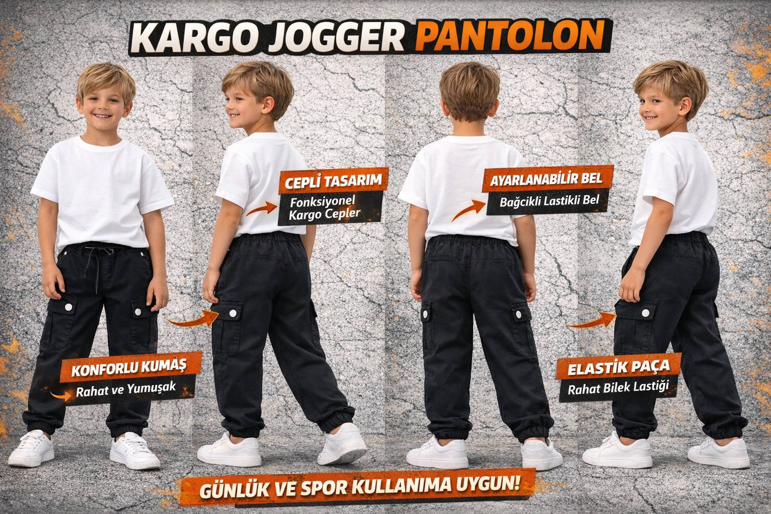 Erkek çocuk kargo cepli beli lastikli gabardin pantolon