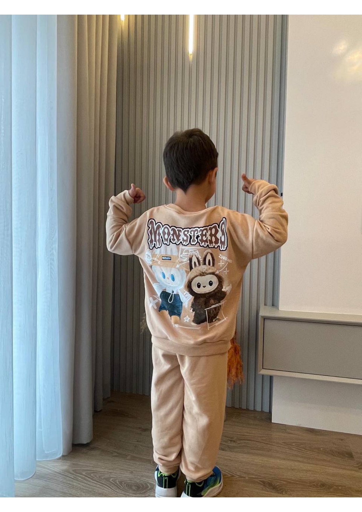 Erkek çocuk labubu baskılı krem renk takım