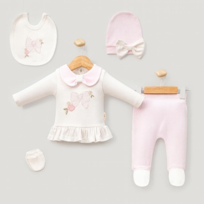 Kız Bebek fiyonk işlemeli 5 parça zıbın seti