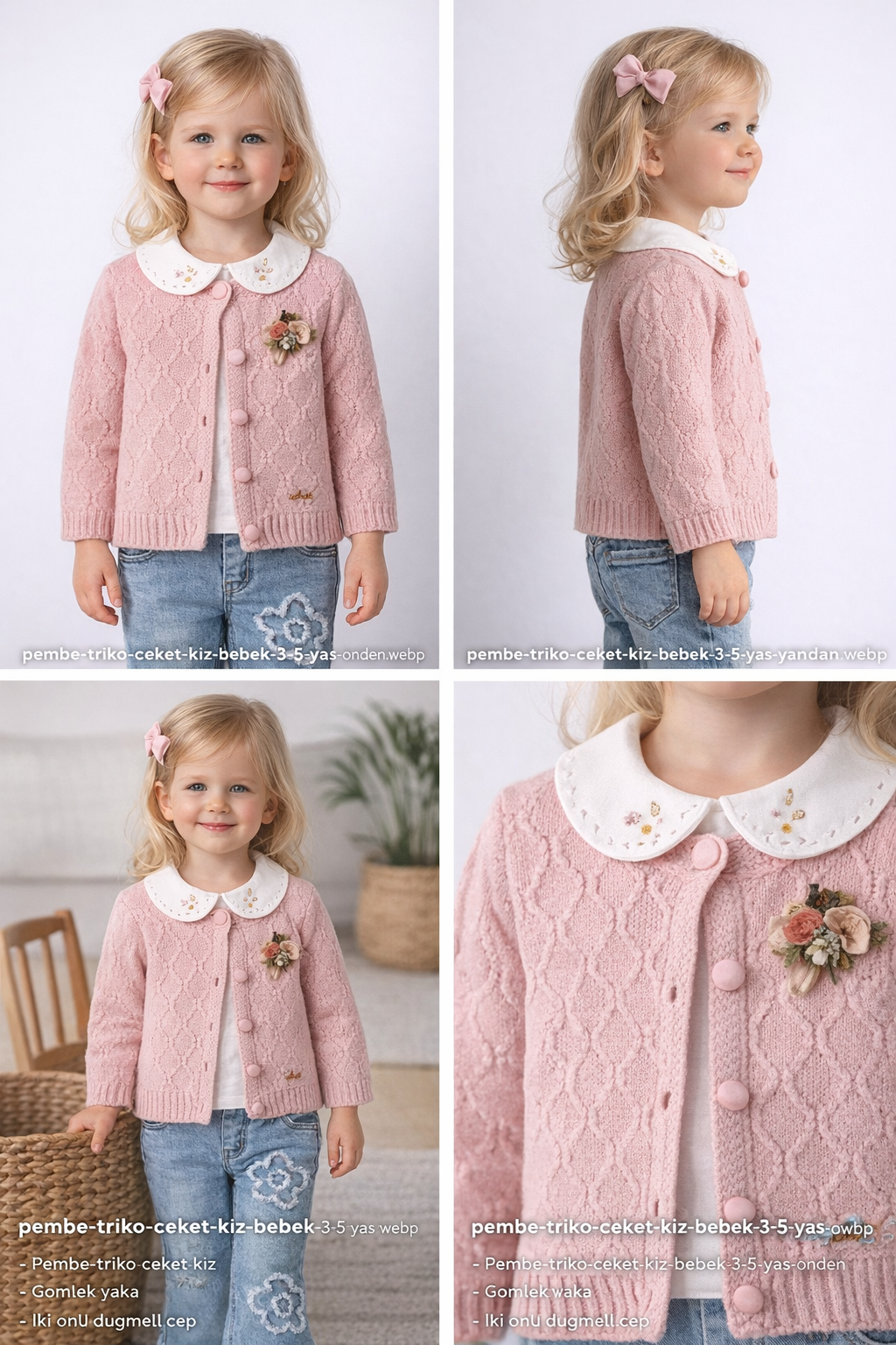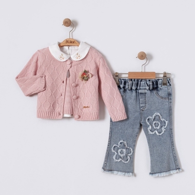 Kız Bebek hırkalı-v yaka süveterli- uzun kol gömlekli -çiçek işlemeli- kot pantolonlu takım