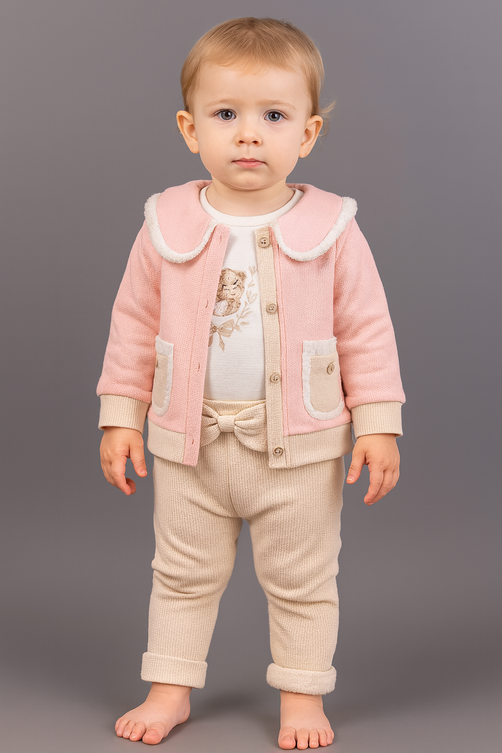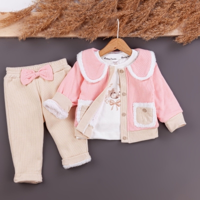 Kız Bebek wafle kumaş cep detaylı 3lü ceket takım