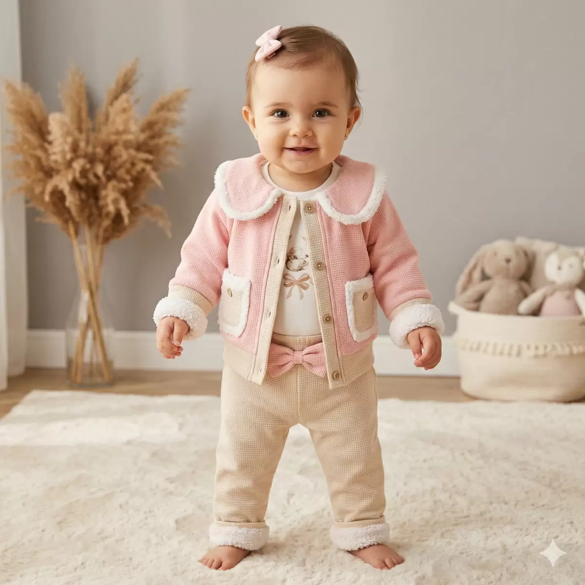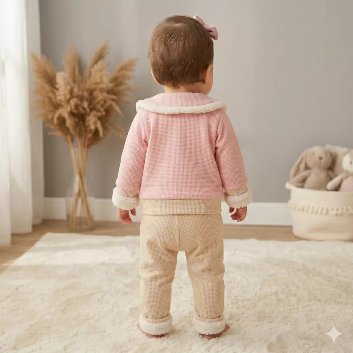 Sevimli Detaylar: Bej rengi pantolonun belindeki pembe fiyonk detayı ve paçalarındaki kürk süslemeler, takımı tamamlayan şık dokunuşlardır.