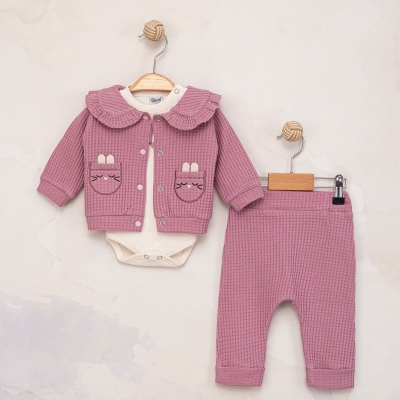 Kız Bebek waflle kumaşlı- fırfır yakalı-zıbınlı 3lü takım